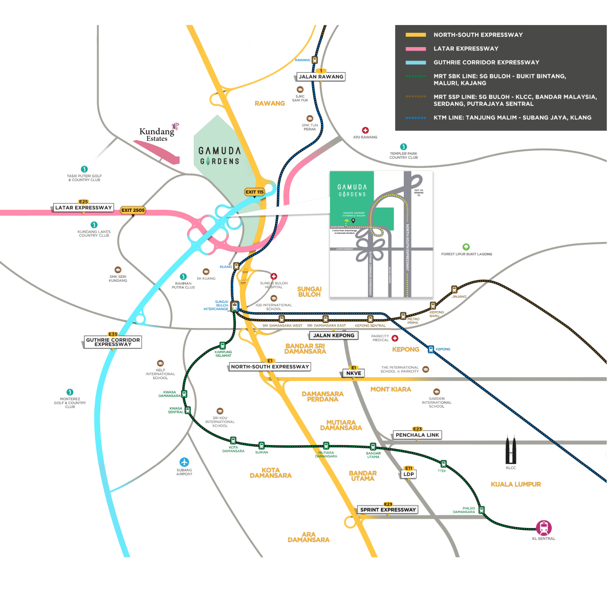 Located in the northern end of Kuala Lumpur, Gamuda Gardens is a mere 5-minute drive away from the confluence of the Guthrie, LATAR and North-South expressways. From there, you are connected to KL, other cities and attractions through the network of highways and public transportations.