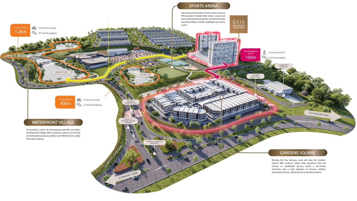The Gaia Boulevard is only an elevator ride away to eateries, laundrettes, dessert and convenience stores. Residents may also opt to take an e-scooter ride from here or board the shuttle bus that makes its rounds around Gamuda Gardens.