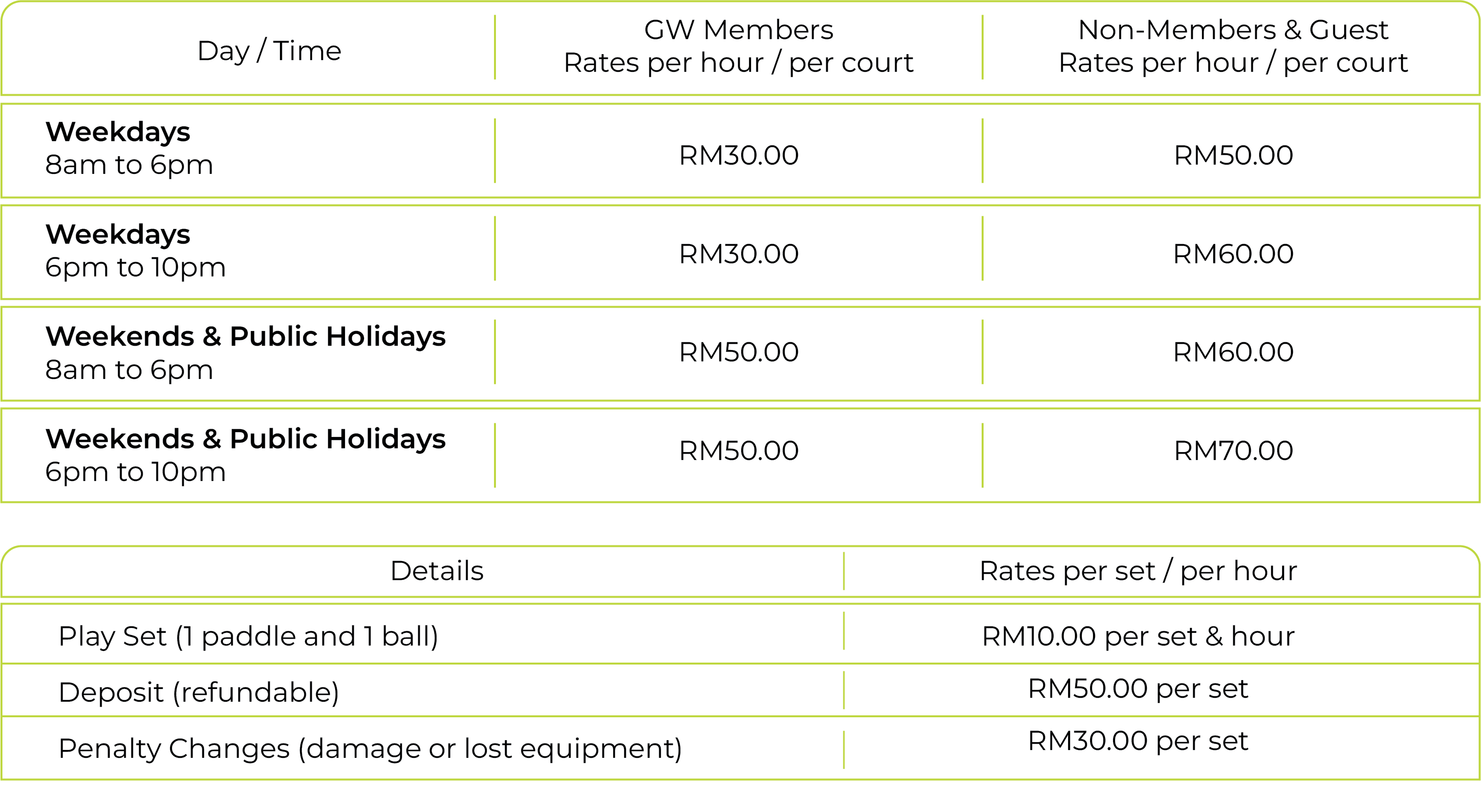 For facility / lessons details and booking purpose, please contact Sport Counter at 03-60870088.
